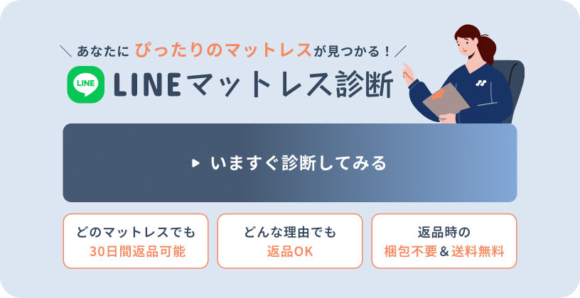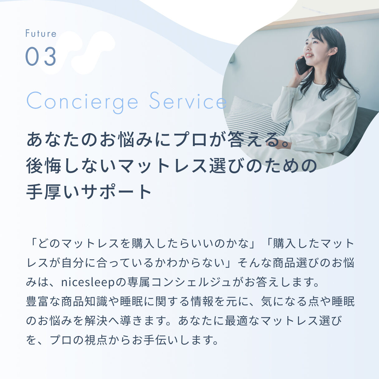 「どのマットレスを購入したらいいのかな」「購入したマットレスが自分に合っているかわからない」そんな商品選びのお悩みは、nicesleepの専属コンシェルジュがお答えします。豊富な商品知識や睡眠に関する情報を元に、気になる点や睡眠のお悩みを解決へ導きます。あなたに最適なマットレス選びを、プロの視点からお手伝いします。 メールアドレス:support@nicesleep.com 電話:050-1725-6554(平日10:00〜18:00)