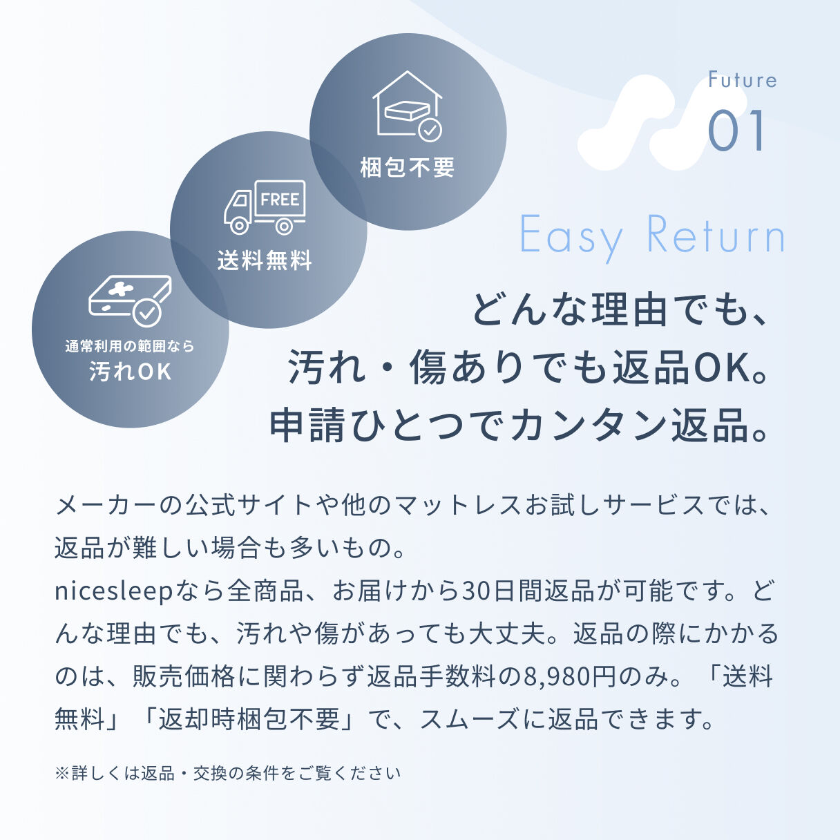 メーカーの公式サイトや他のマットレスお試しサービスでは、返品が難しい場合も多いもの。 nicesleepなら全商品、お届けから30日間返品が可能です。どんな理由でも、汚れや傷があっても大丈夫。返品の際にかかるのは、販売価格に関わらず返品手数料の8,980円のみ。「送料無料」「返却時梱包不要」で、スムーズに返品できます。 ※詳しくは返品・交換の条件をご覧ください