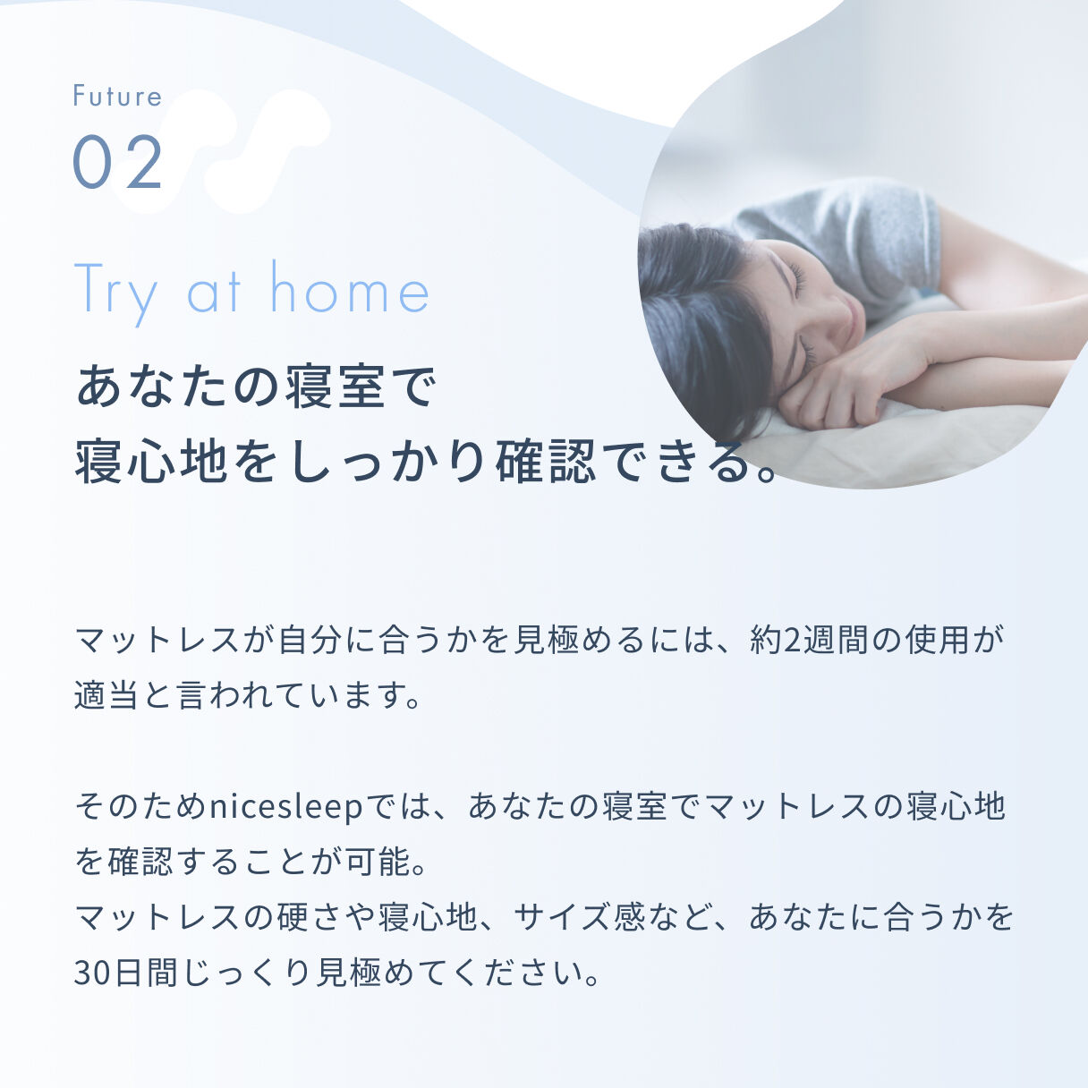 マットレスが自分に合うかを見極めるには、約2週間の使用が適当と言われています。そのためnicesleepでは、あなたの寝室でマットレスの寝心地を確認することが可能。マットレスの硬さや寝心地、サイズ感など、あなたに合うかを30日間じっくり見極めてください。